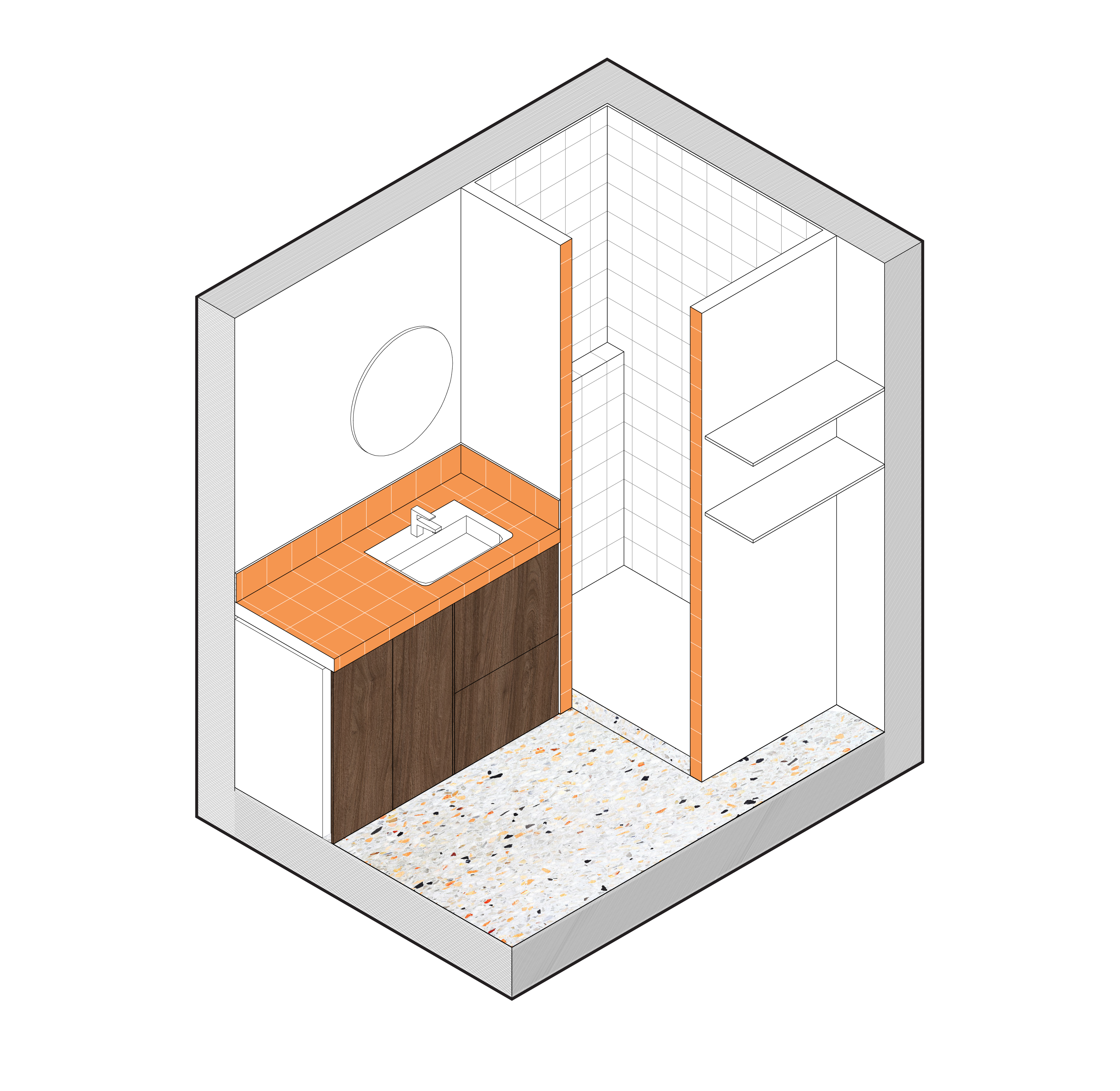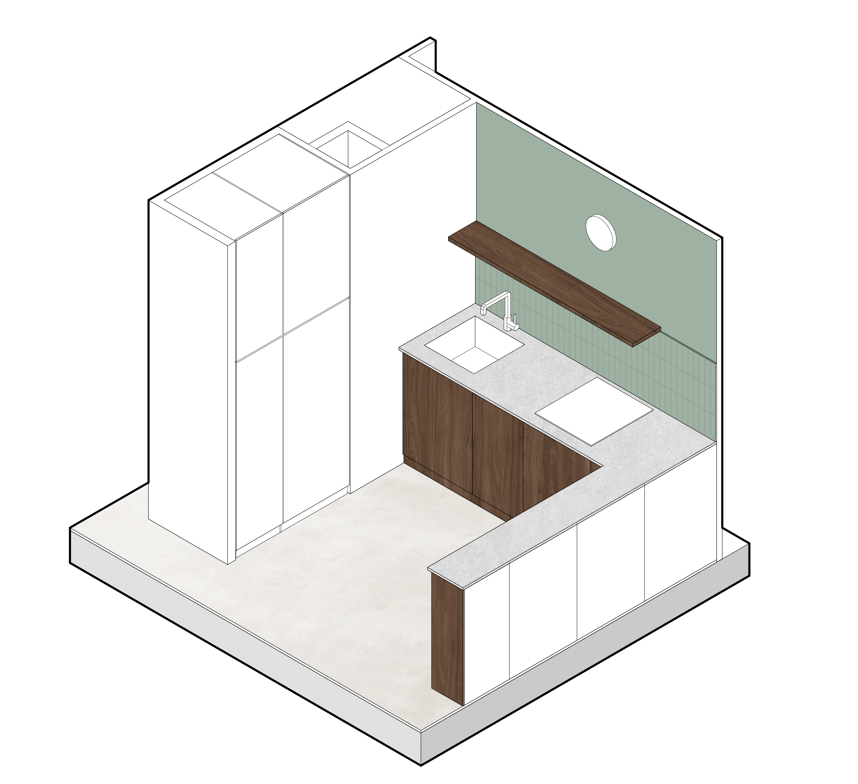 L’appartement est situé dans une résidence des années 1970, près des berges de Maine, à Angers. Par une réflexion sur le décloisonnement, le projet cherche à optimiser l’espace et les circulations afin de gagner en fluidité et en lumière. L’ancienne cuisine, l’entrée et le séjour sont fusionnés créant un espace de vie généreux qui bénéficie pleinement des larges ouvertures sur sa façade exposée Sud-Ouest. La cuisine est entièrement réaménagée et équipée, avec d’un côté un plan de travail et des meubles bas qui se déploient sous la fenêtre, et d’un autre côté, une grande colonne de rangements dissimulée dans une niche, qui vient aussi redessiner une entrée intimiste.